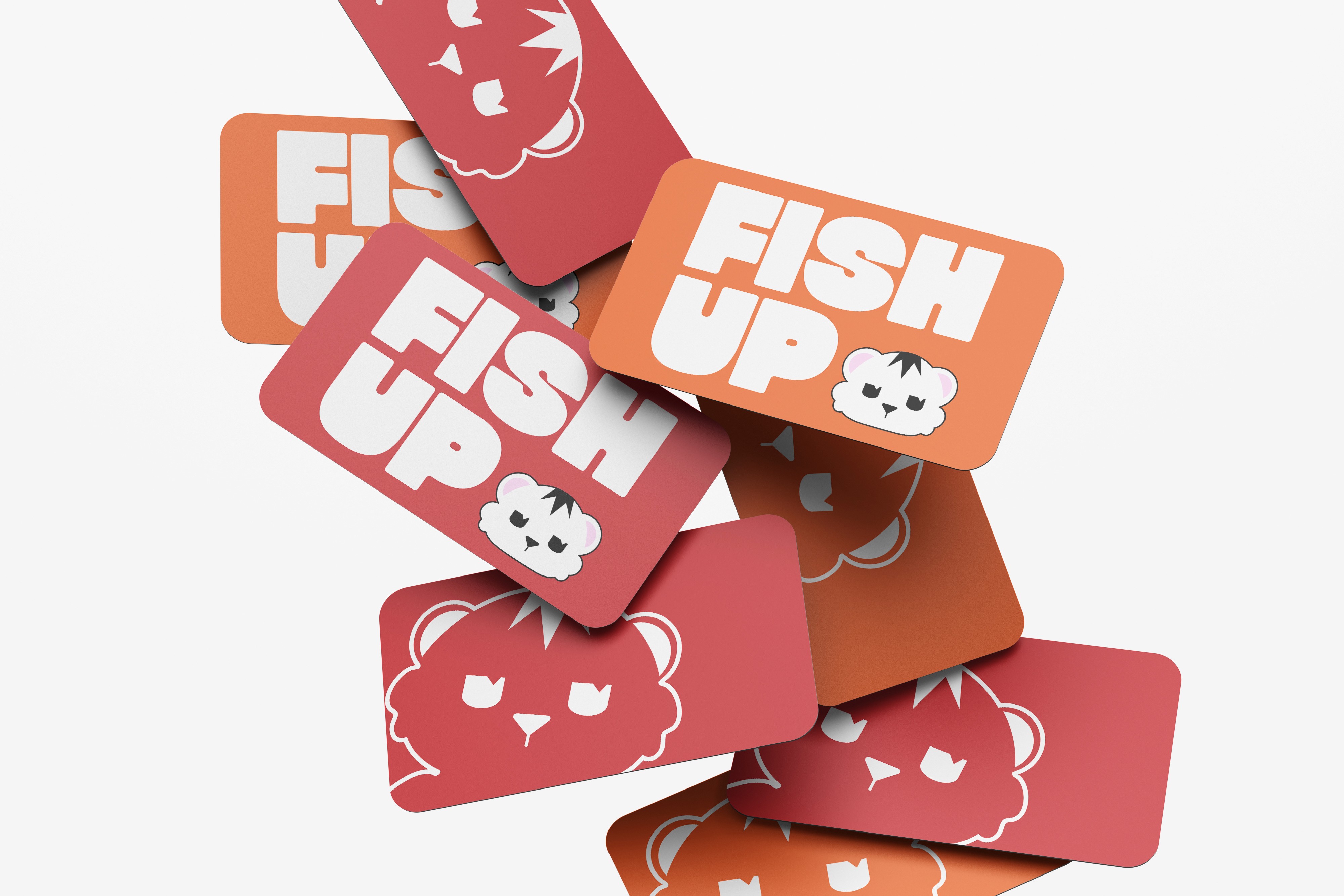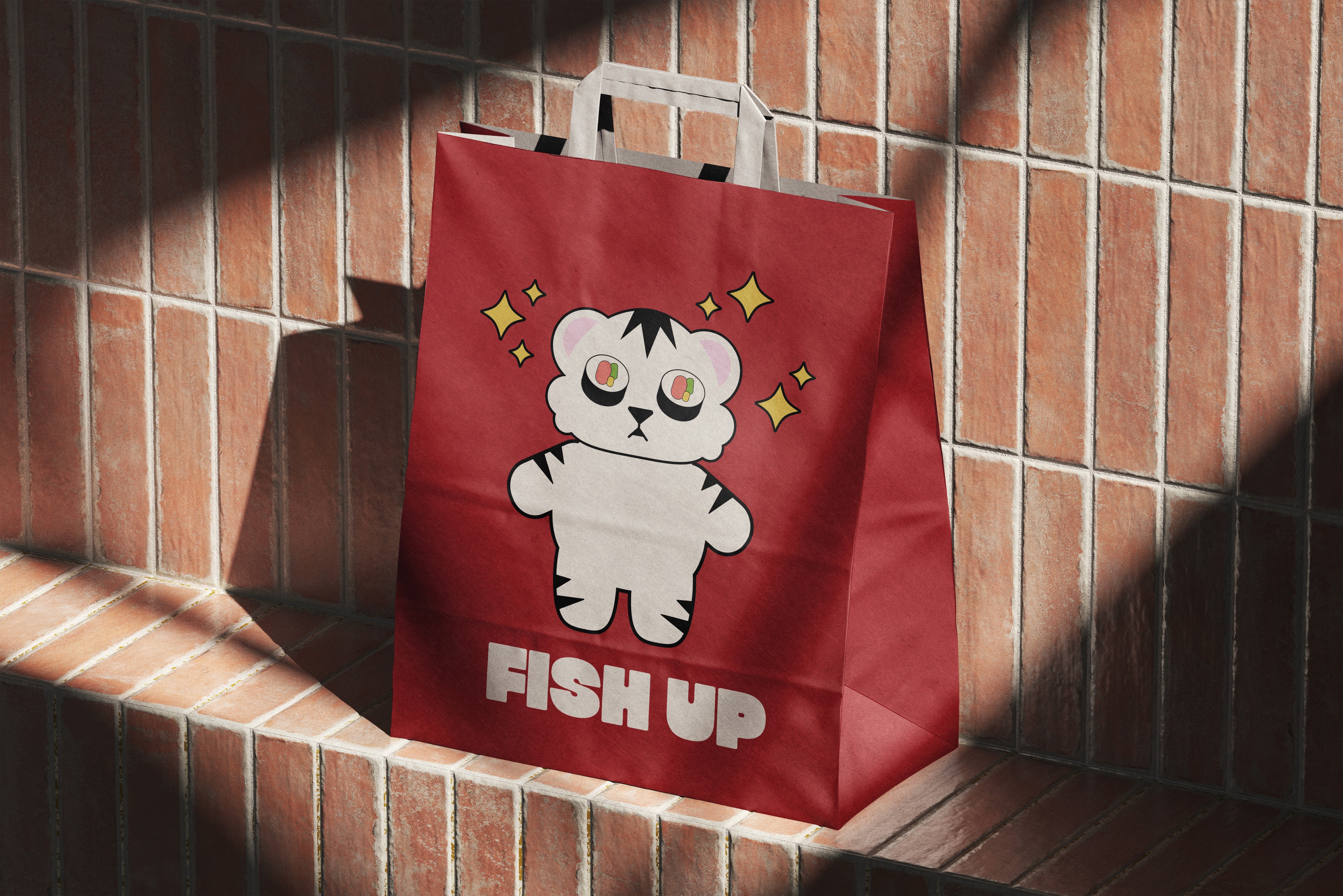 FISH UP is bold, snappy branding for a modern sushi joint. It features a tiger mascot, rendered in both 2D and 3D graphics.